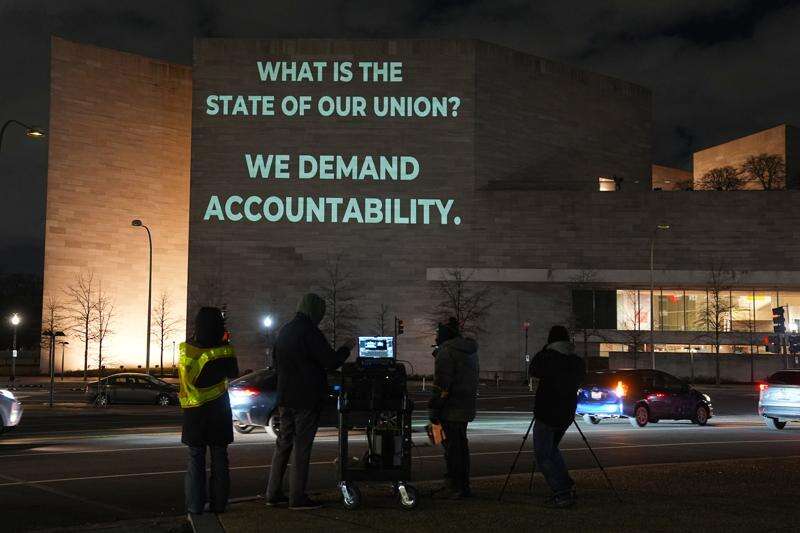 An image is projected onto the exterior wall of the National Gallery of Art near the U.S. Capitol in Washington, Monday, Feb. 23, 2026, ahead of President Donald Trump's State of the Union address. (AP Photo/Matt Rourke)