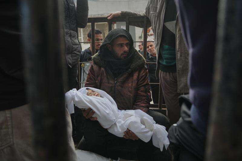 A relative holds the body of a few-months-old girl, Mira al-Khabbaz, after she was killed in an Israeli military strike, ahead of her burial at Shifa Hospital in Gaza City, Wednesday, Feb. 4, 2026. (AP Photo/Jehad Alshrafi)