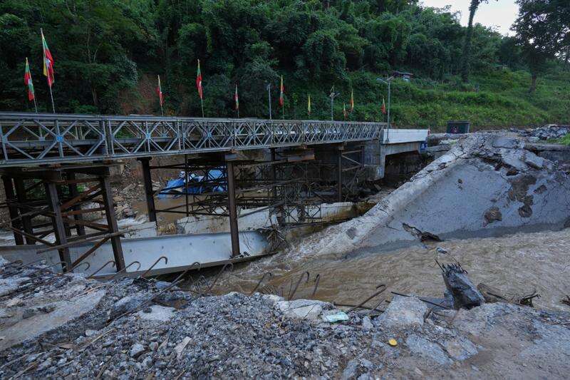 In this photo taken during a trip supervised by pro-military Myanmar media, the damaged Gotwin bridge is seen in Kawnghkio township, northern Shan State, Myanmar, Friday, Oct. 10, 2025. (AP Photo/Aung Shine Oo)