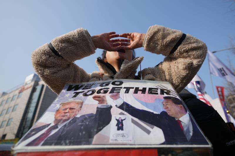 Supporters of former South Korean President Yoon Suk Yeol hold signs and flags outside Seoul Central District Court, in Seoul, South Korea, Friday, Jan. 16, 2026. (AP Photo/Lee Jin-man)