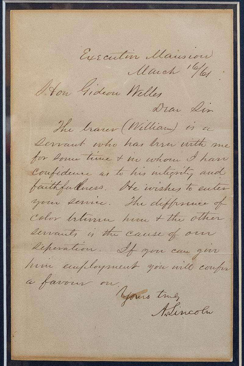 “The difference of color between him and the other servants is the cause of our separation,” Lincoln wrote in the March 16, 1861, letter that private collector Peter Tuite donated in August to the Abraham Lincoln Presidential Library and Museum, where it is now on public display. The letter's recipient, Navy Secretary Gideon Welles, reported he had no position available.