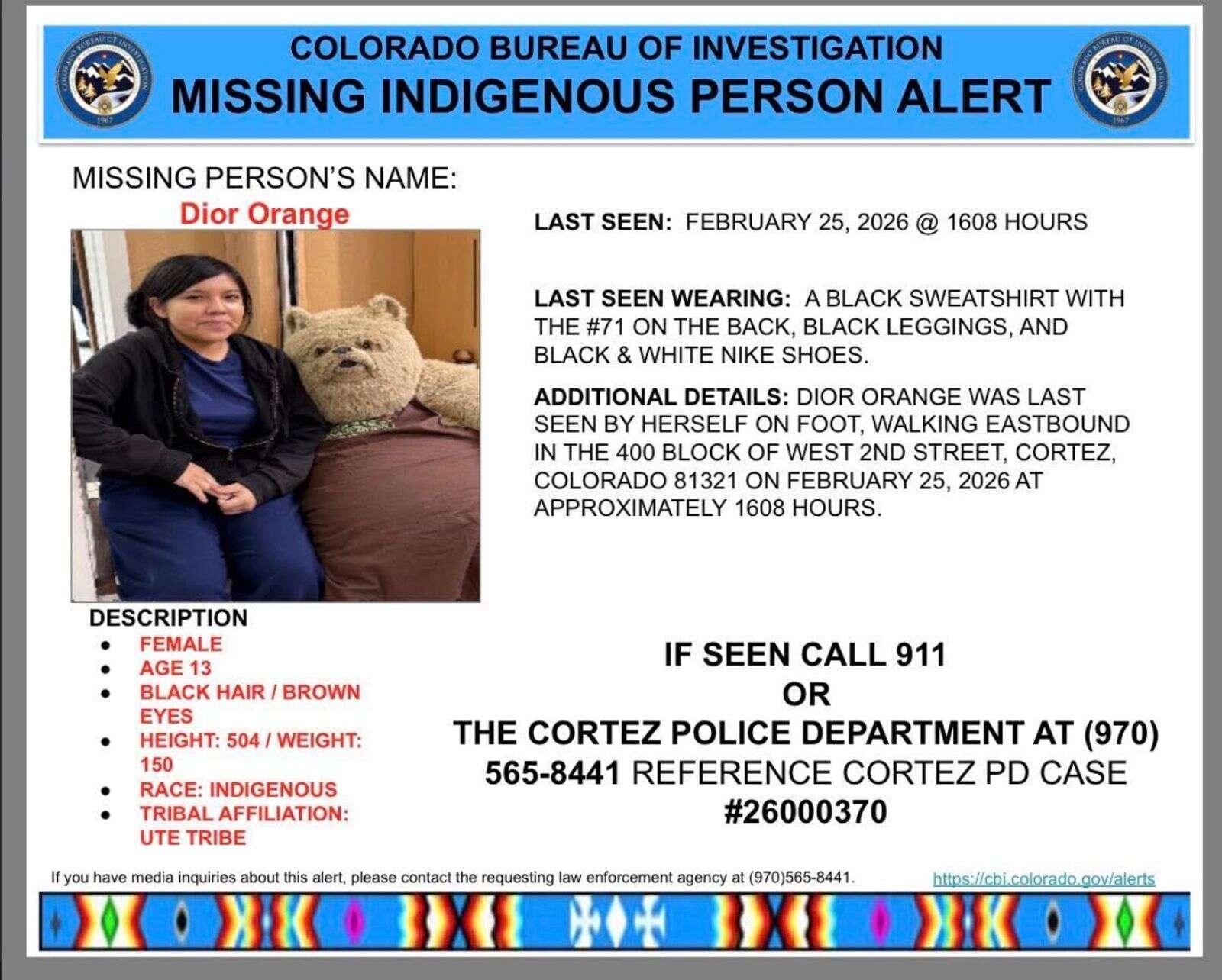 The Colorado Bureau of Investigation has activated a Missing Indigenous Person Alert for a 13-year-old girl last seen on Wednesday, walking eastbound by herself in the 400 block of West Second Street, about 4:08 p.m.