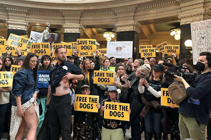 MADISON, Wis. (AP) — Animal welfare activists converged outside of Wisconsin Gov. Tony Evers' Capitol office on Monday, chanting “Free the dogs!” and demanding that the governor and attorney general do what they can to shut down a beagle breeding and research facility where many of the protesters clashed with police two days earlier.