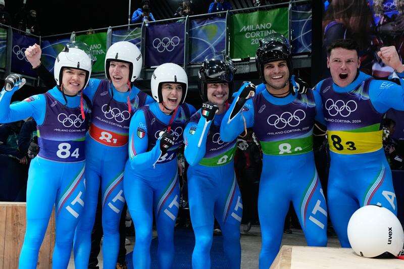 Italy's Verena Hofer, Simon Kainzwaldner, Marion Oberhofer, Andrea Voetter, Emanuel Rieder and Dominik Fischnaller celebrate during the luge relay competition at the 2026 Winter Olympics, in Cortina d'Ampezzo, Italy, Thursday, Feb. 12, 2026. (AP Photo/Alessandra Tarantino)