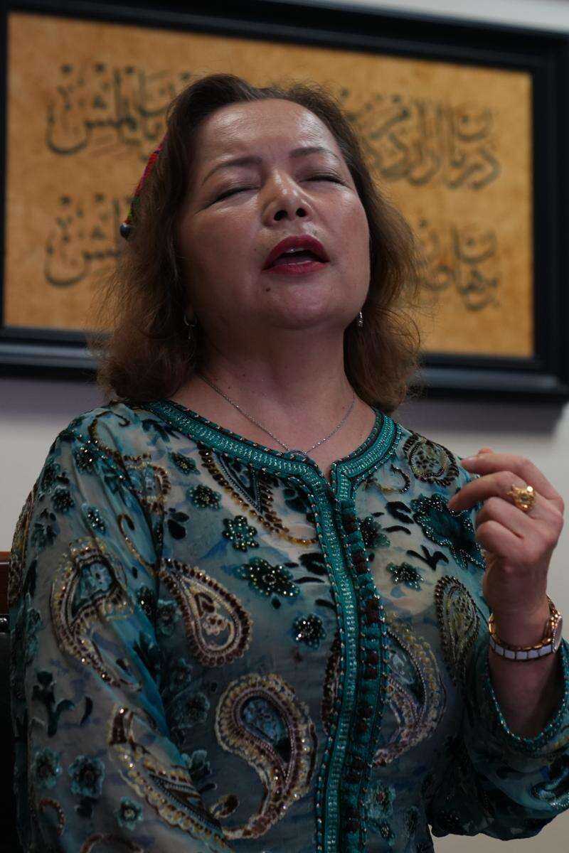 Rahima Mahmut, Uyghur human rights activist, performs with the London Uyghur Ensemble during an interview with The Associated Press in London, Wednesday, Oct. 8, 2025. (AP Photo/Joanna Chan)