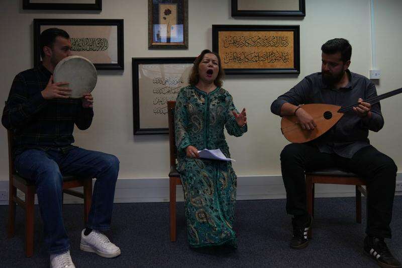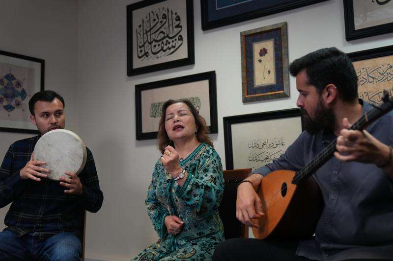 The London Uyghur Ensemble perform during an interview with The Associated Press in London, Wednesday, Oct. 8, 2025. (AP Photo/Joanna Chan)