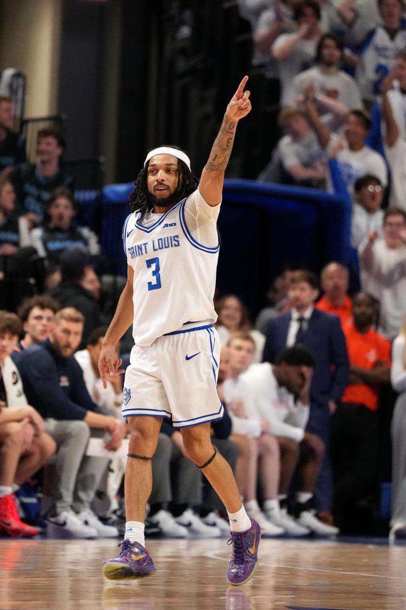 Saint Louis' Trey Green celebrates after making a 3-point basket during the second half of an NCAA college basketball game against Dayton Friday, Jan. 30, 2026, in St. Louis. (AP Photo/Jeff Roberson)