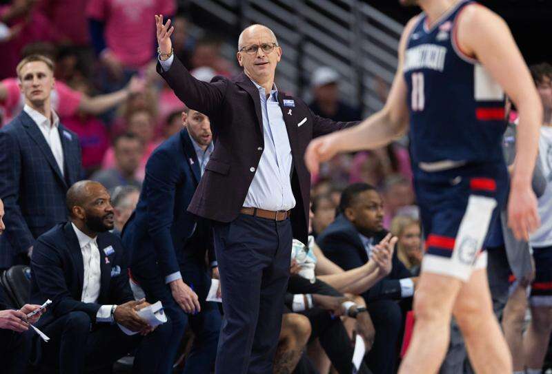 UConn head coach Dan Hurley, center, disputes a referee's call as his team plays against Creighton during the first half of an NCAA college basketball game Saturday, Jan. 31, 2026, in Omaha, Neb. (AP Photo/Rebecca S. Gratz)
