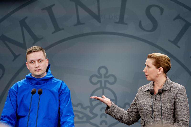 Chairman of the Naalakkersuisut, Greenland, Jens-Frederik Nielsen and Denmark's Prime Minister Mette Frederiksen, right, give a statement on the current situation at a press conference in the Mirror Hall at the Prime Minister's Office in Copenhagen, Tuesday, Jan. 13, 2026. (Liselotte Sabroe/Ritzau Scanpix via AP)