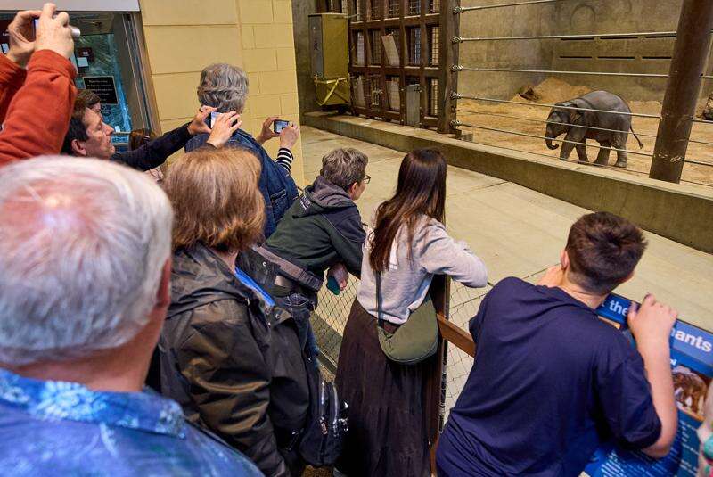 People visit the Elephant Community Center as 10-week-old Asian elephant calf Linh Mai makes her public debut at the National Zoo, Wednesday April 22, 2026, in Washington. (AP Photo/Jacquelyn Martin)