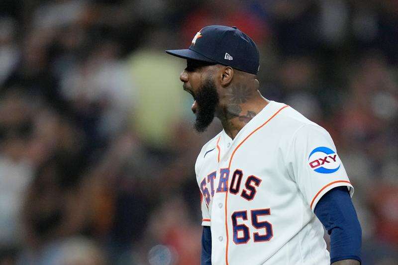 Houston Astros pitcher Enyel de Los Santos (65) yells after a strikeout to earn the save during the ninth inning of a baseball game against the Colorado Rockies, Tuesday, April 14, 2026, in Houston. (AP Photo/Kevin M. Cox)