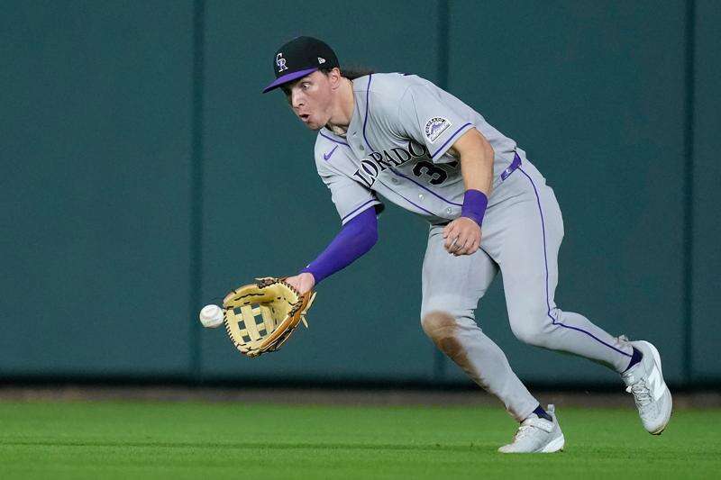 Colorado Rockies center fielder Jake McCarthy (31) fields a single by Houston Astros' Christian Walker during the seventh inning of a baseball game Tuesday, April 14, 2026, in Houston. (AP Photo/Kevin M. Cox)