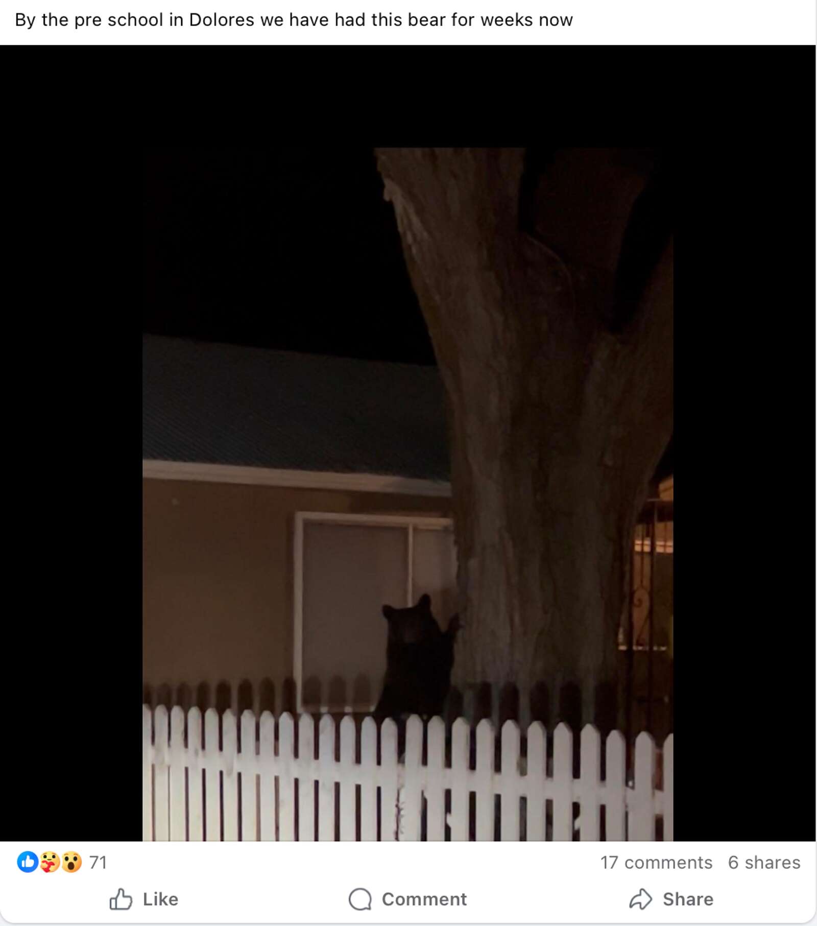 A black bear is pictured near a Dolores preschool in early November, shown in a Facebook post. Bears enter dens starting mid-September and through late November, per information from Bear Smart Durango, with females and cubs denning before adult males. (Facebook)