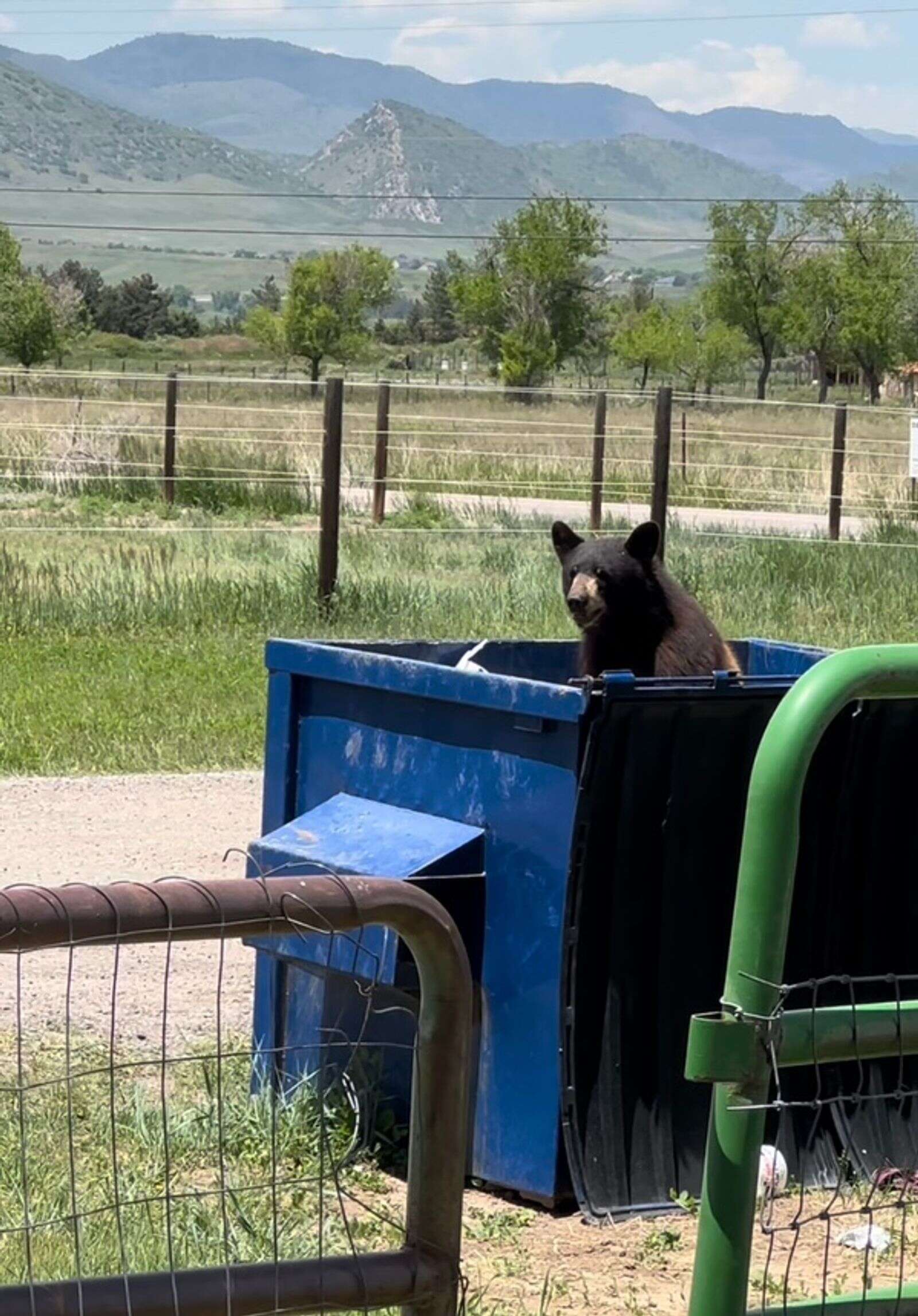 A black bear in spring 2024 pokes its head out of the dumpster. Per Bear Smart Durango, bears emerge from their dens in spring and forage in areas of lower elevation, seeking fresh vegetation. Colorado Parks and Wildlife)
