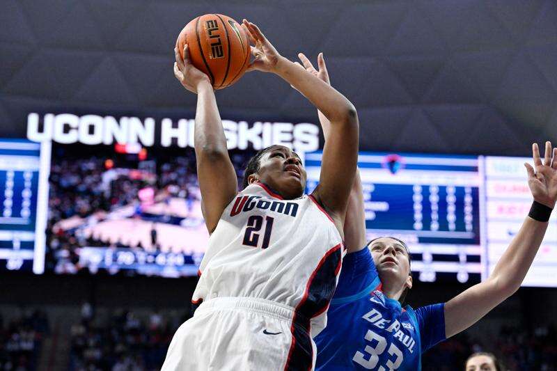 UConn forward Sarah Strong (21) looks to shoot as DePaul guard Kate Novik (33) defends in the second half of an NCAA college basketball game, Sunday, Dec. 7, 2025, in Storrs, Conn. (AP Photo/Jessica Hill)