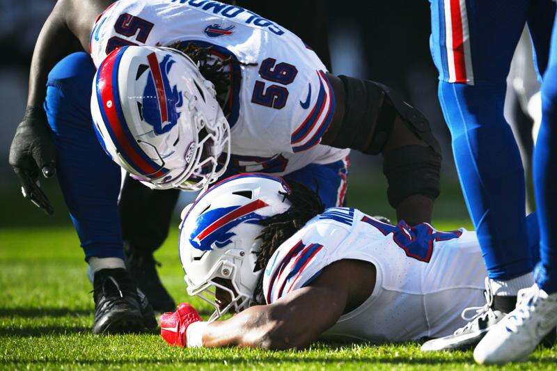 Buffalo Bills defensive end Javon Solomon (56) checks on linebacker Dorian Williams (42) after an injury during the first half of an NFL divisional round playoff football game against the Denver Broncos, Saturday, Jan. 17, 2026, in Pittsburgh. (AP Photo/RJ Sangosti)