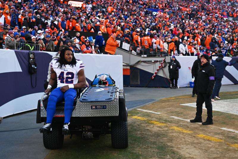 Buffalo Bills linebacker Dorian Williams (42) leaves the field with an injury during the first half of an NFL divisional round playoff football game against the Denver Broncos, Saturday, Jan. 17, 2026, in Pittsburgh. (AP Photo/RJ Sangosti)