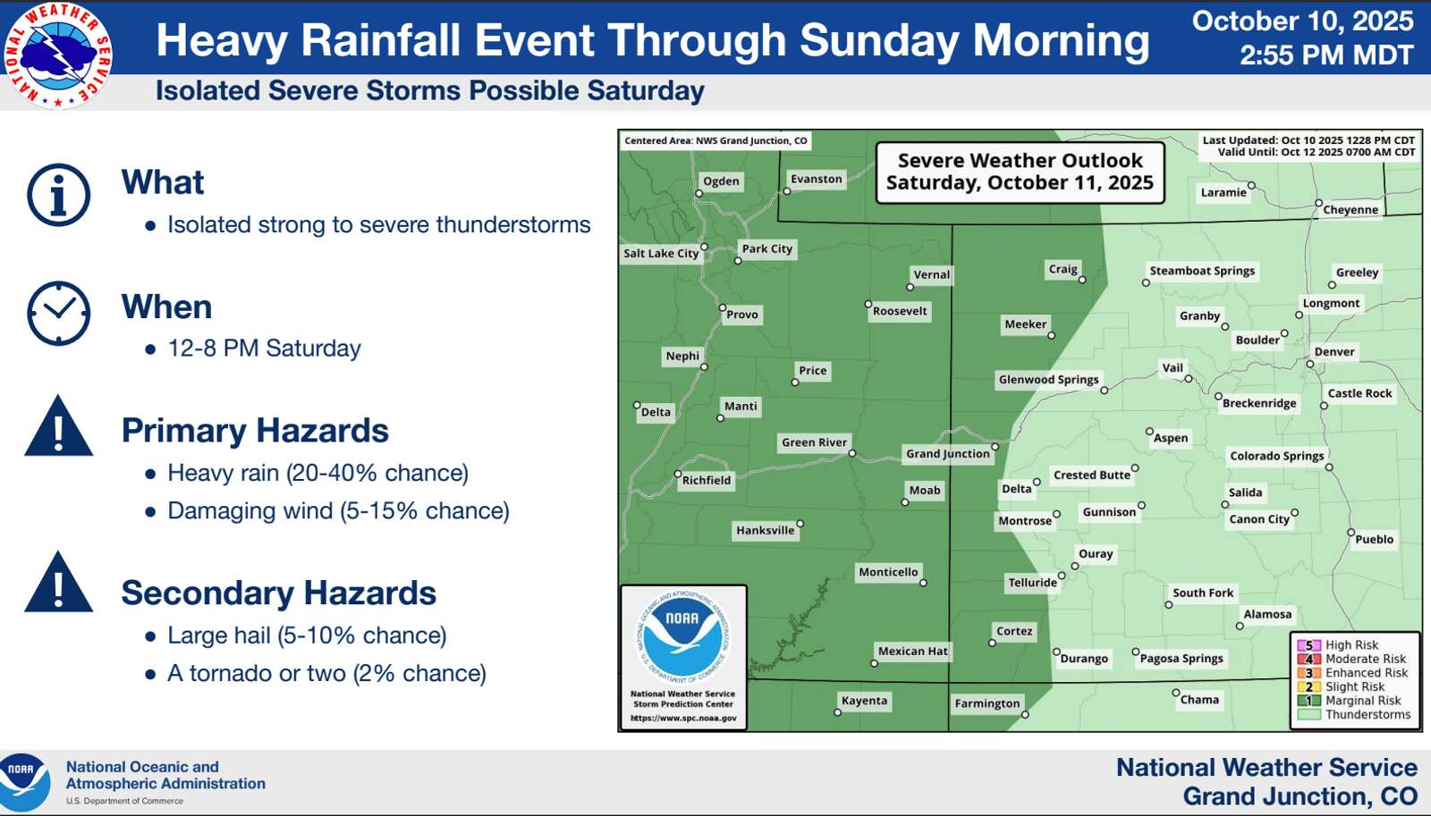 Meteorologist Brianna Bealo with the Grand Junction NWS office said the latest model guidance shows “not a catastrophic, but unusual system” capable of producing isolated strong thunderstorms Saturday afternoon. The Storm Prediction Center has outlined a 2% chance of tornadoes, 5% chance of large hail or damaging winds and 20-40% chance of heavy rains across the Four Corners region occurring from noon to 8 p.m. Saturday.