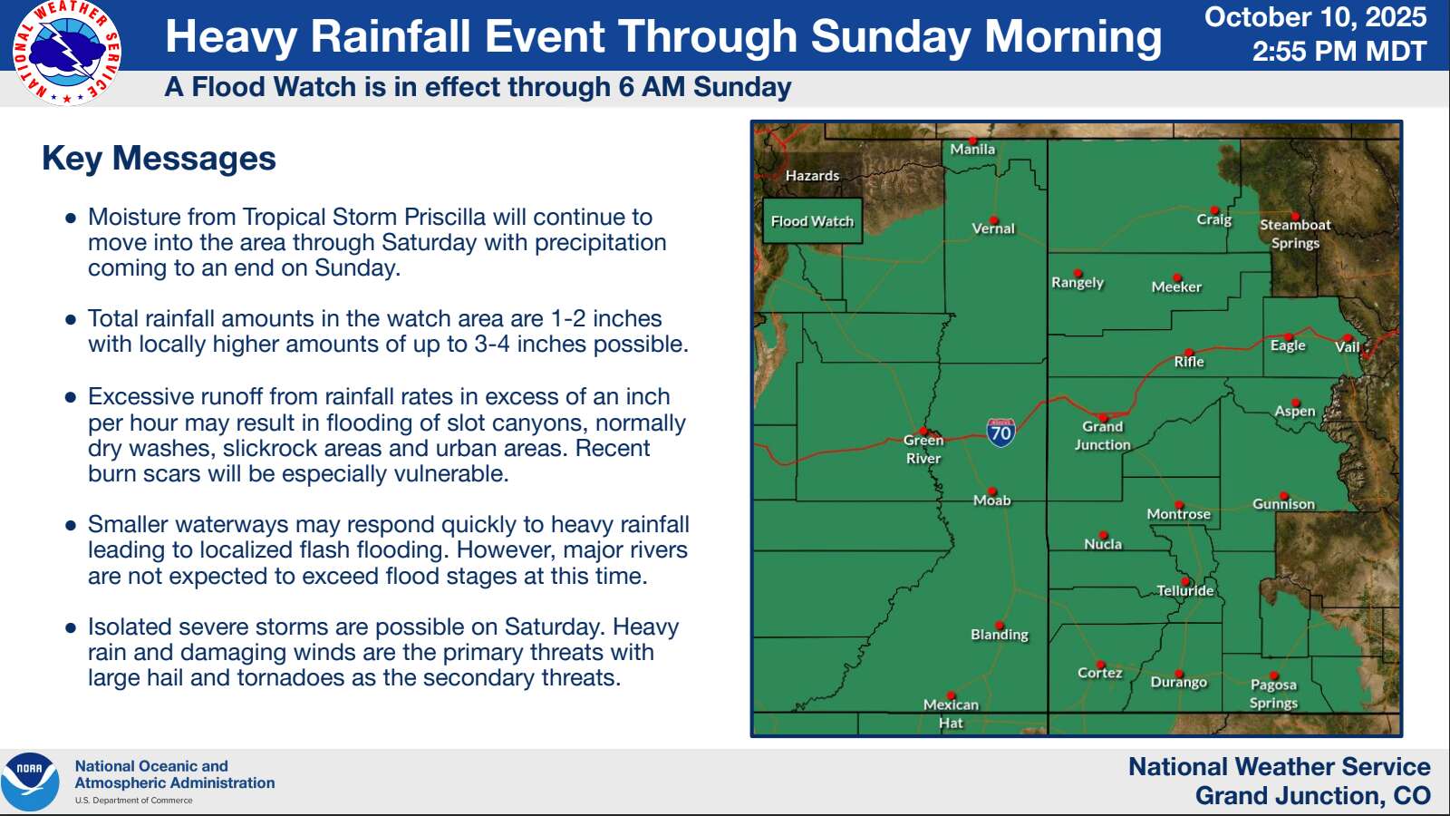 National Weather Service forecasters have increased rainfall projections and added a low chance of severe storms across Southwest Colorado this weekend, as tropical moisture from Hurricane Priscilla continues moving north.