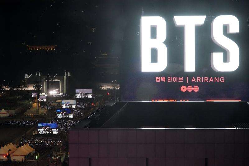 The BTS concert, which began at 8 p.m., drew several tens of thousands to the Gwanghwamun area, including 22,000 fans who secured free seats in the designated viewing zone and others who watched on screens nearby. The show was streamed live on Netflix.