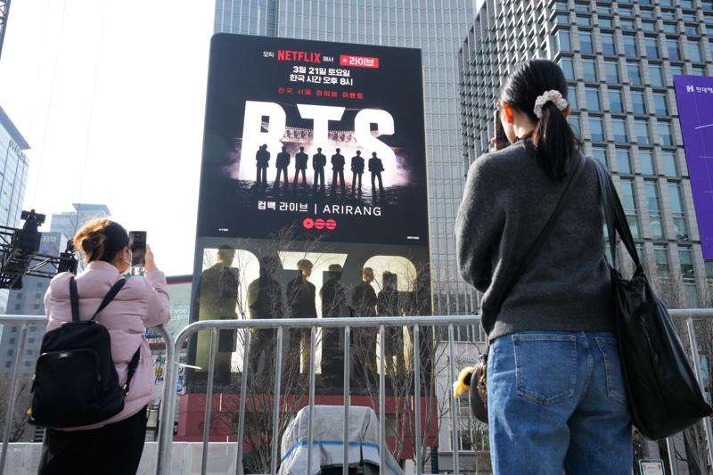 People take photos of a screen promoting a comeback concert of K-pop group BTS at Gwanghwamun Square in Seoul, Wednesday, March 18, 2026. (AP Photo/Ahn Young-joon)