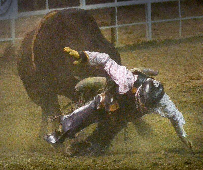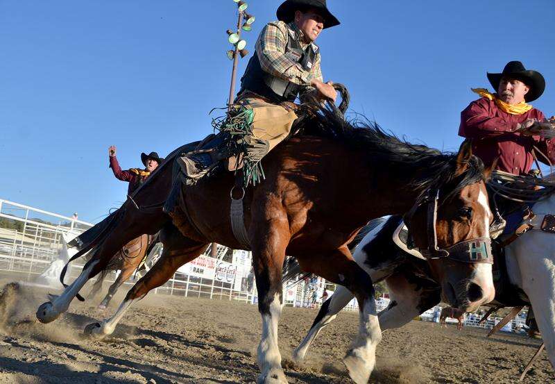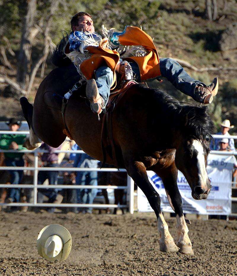 Casey Colletti loses his hat but not his grip on Brown Robin as the horse tries to throw him off in the bareback riding event.