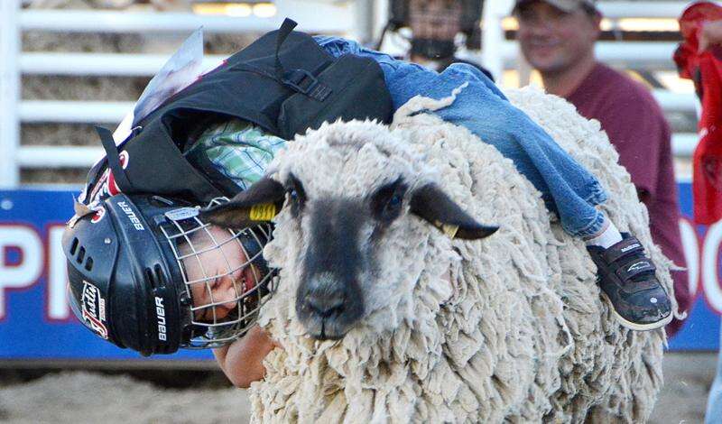 Collin Duncan hugs a sheep as he tries to hang on during the mutton bustin’.
