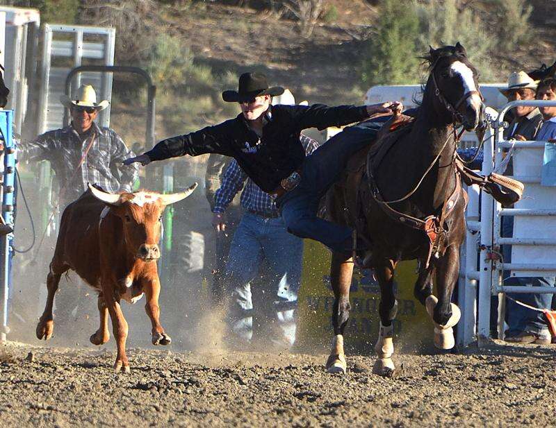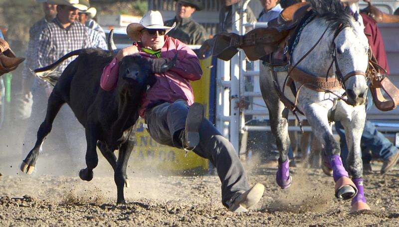 Grabbing a steer by the horns, Justin Simon wrestles the animal to the ground at the Ute Mountain Rodeo.