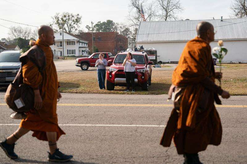 A group of Buddhist monks and their rescue dog are striding single file down country roads and highways across the South, captivating Americans nationwide and inspiring droves of locals to greet them along their route.