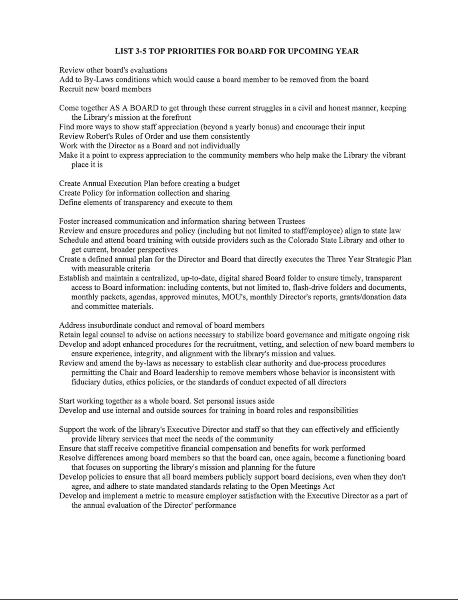 The board agreed to add the topics and later voted to schedule two work sessions next year, in August and late October, to review board performance, set goals and begin the director’s annual evaluation process.