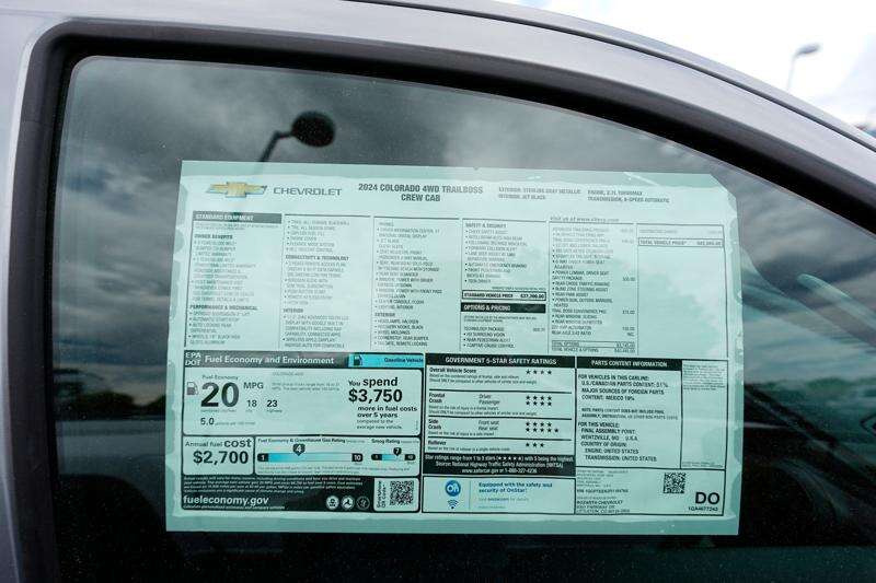 FILE - A sticker shows the price for an unsold 2024 Colorado pickup truck at a Chevrolet dealership Sunday, June 2, 2024, in Lone Tree, Colo. (AP Photo/David Zalubowski, File)