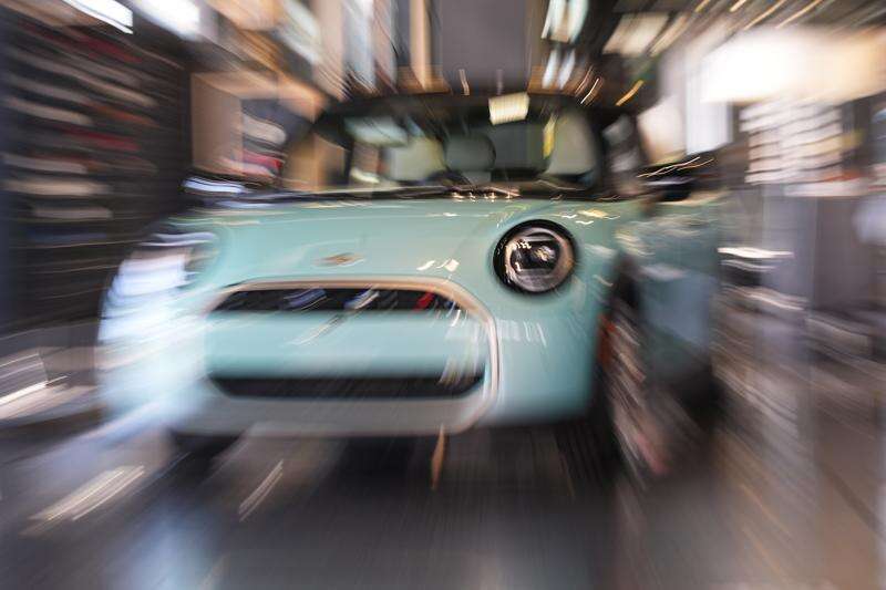 FILE - Made with a slow shutter speed and zoom lens, an unsold 2026 Cooper S hardtop is diplayed in a Mini dealership Friday, Oct. 24, 2025, in Highlands Ranch, Colo. (AP Photo/David Zalubowski, File)