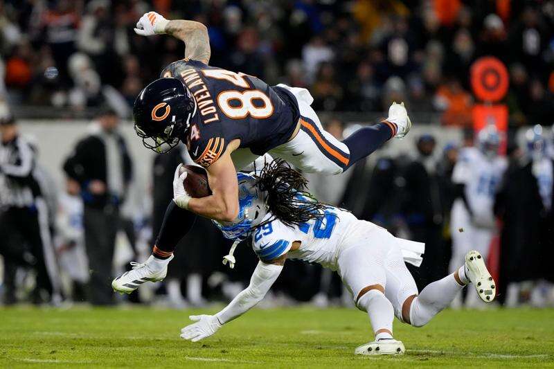 Chicago Bears tight end Colston Loveland (84) is tackled by Detroit Lions cornerback Avonte Maddox (29) during the second half of an NFL football game, Sunday, Jan. 4, 2026, in Chicago. (AP Photo/Nam Y. Huh)