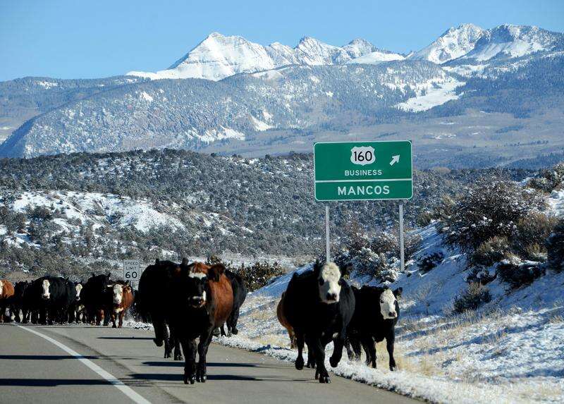 As snow piles up in the high country, cowboys move their cattle from the mountains through Mancos to lower pastures to feed for the winter.