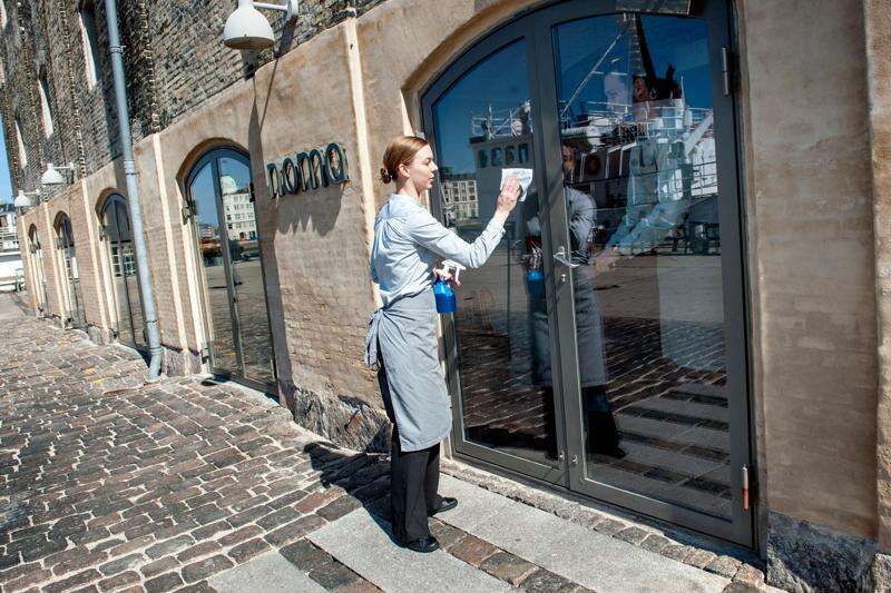 A staff member polishes the glass doors outside a Noma restaurant in Copenhagen, Tuesday, May 1, 2012. (Keld Navntoft/Ritzau Scanpix via AP)