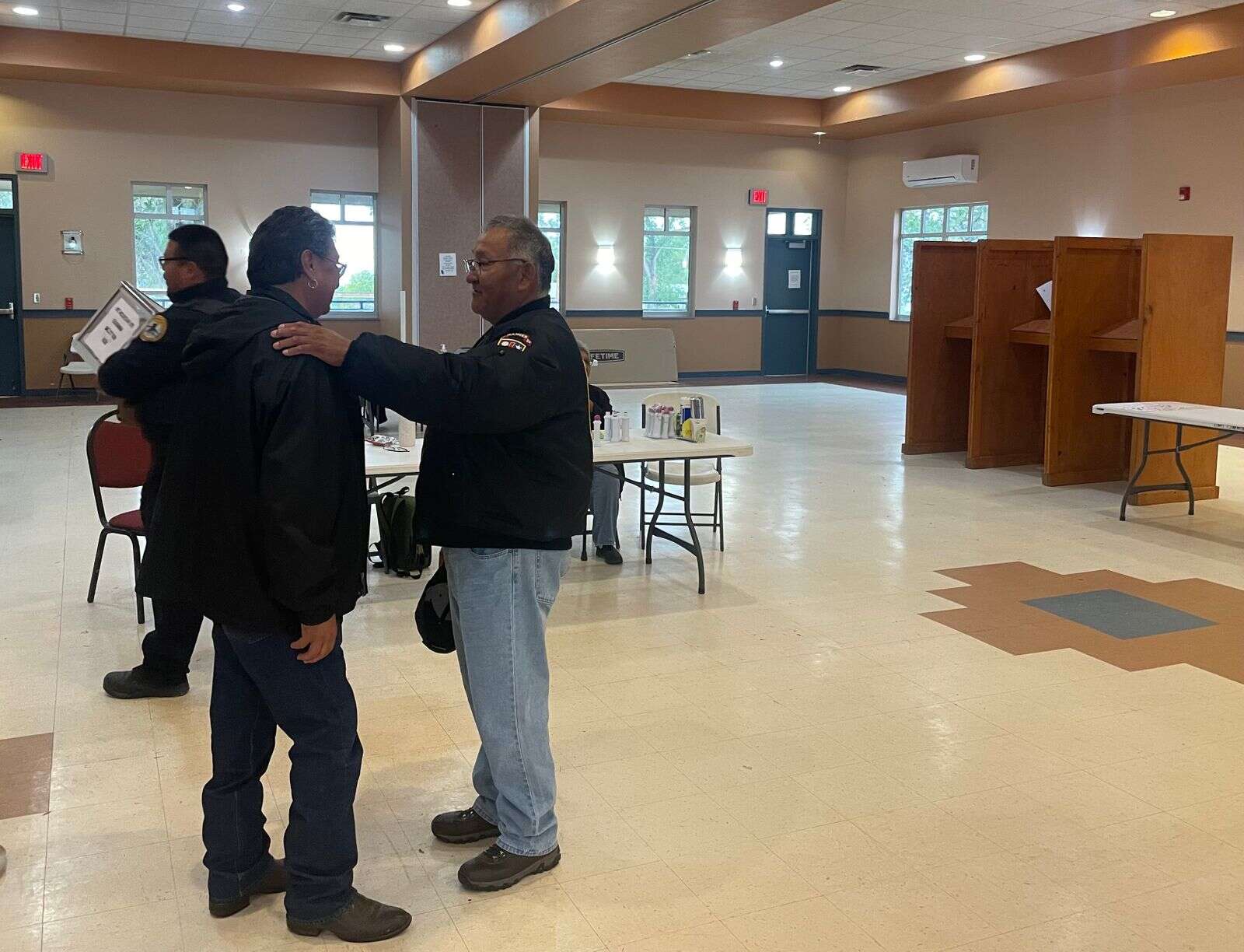 New unofficially elected Ute Mountain Ute Chairman Selwyn Whiteskunk (right) talks with outgoing Chairman Manuel Heart shortly after the election board announces initial numbers behind Whiteskunk’s win. Behind the two men, a Bureau of Indian Affairs law enforcement officer carries away a ballot box. (Benjamin Rubin/The Journal)