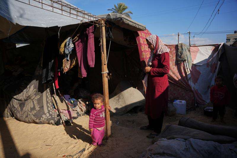 DEIR AL-BALAH, Gaza Strip (AP) — Barefoot children played on chilly sand as Gaza ’s thousands of displaced people prepared threadbare tents on Saturday for another round of winter rain.