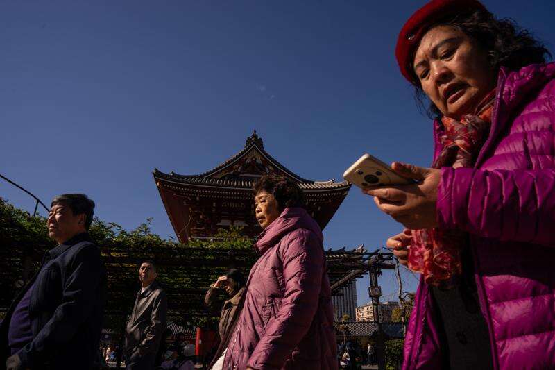 FILE - Mainland Chinese tourists visit Sensoji temple in the Asakusa district of Tokyo, Thursday, Nov. 20, 2025. (AP Photo/Louise Delmotte, File)