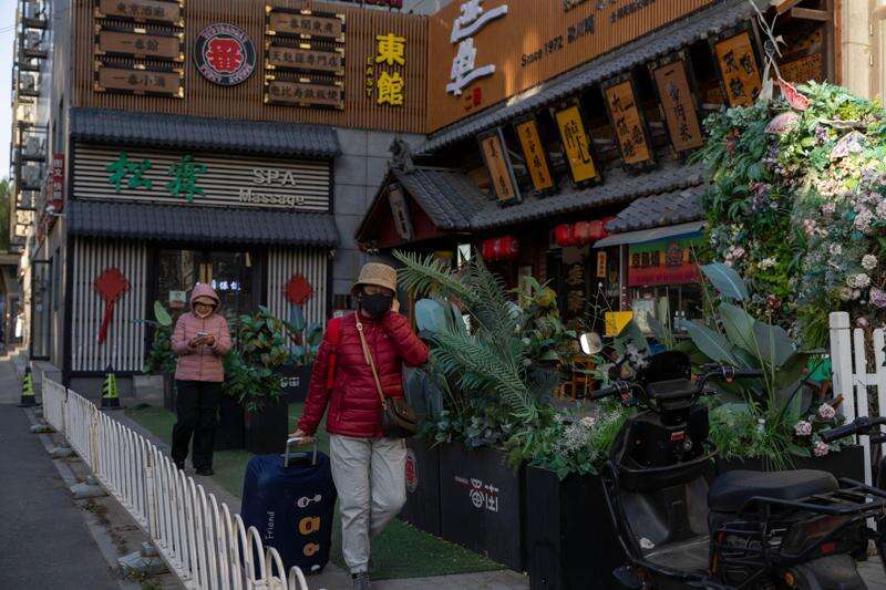 A woman pulls her luggage past a building known for its Japanese restaurants in Beijing, on Nov. 24, 2025. (AP Photo/Ng Han Guan)