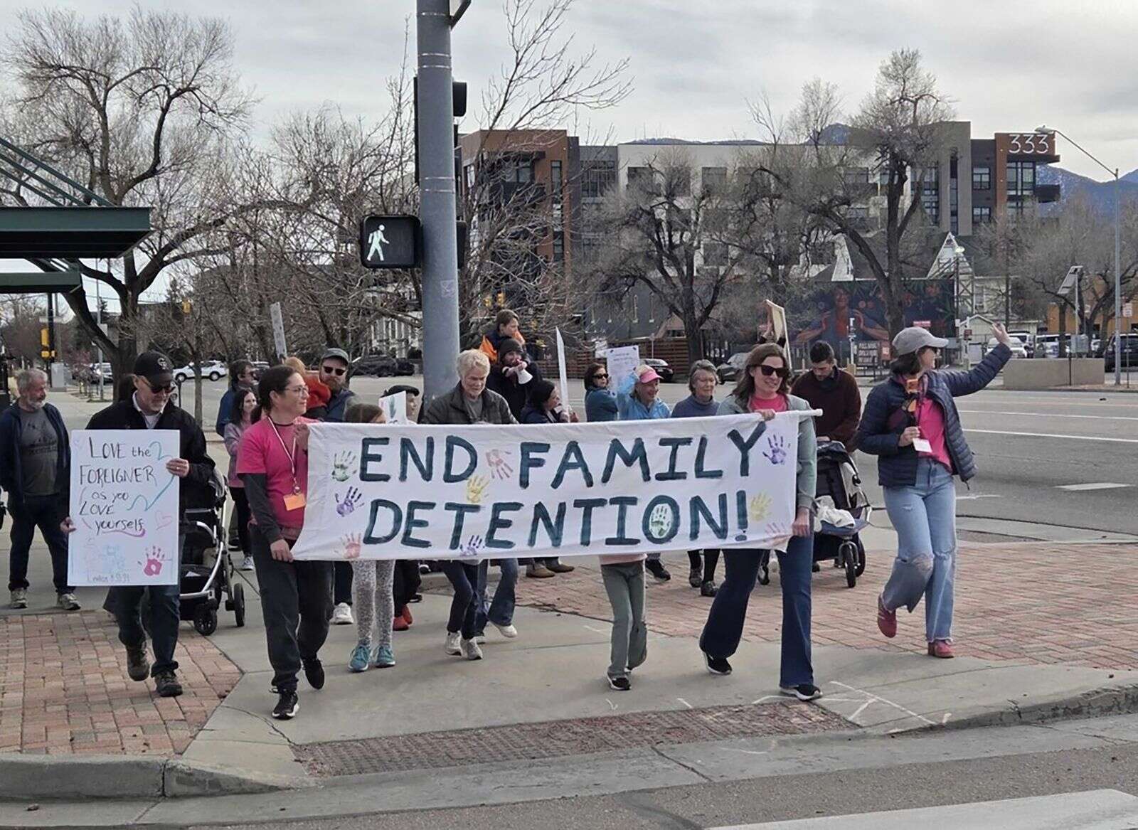 About 60 teachers, students and community members marched in downtown Colorado Springs on March 12, 2026, calling for officials and state lawmakers to release the El Gamal family from ICE custody and end the practice of family detention. The demonstration, one of three held that week, was organized by a local group of Christian mothers, Neighbors of Faith and Conviction. (Olivia Prentzel/The Colorado Sun)