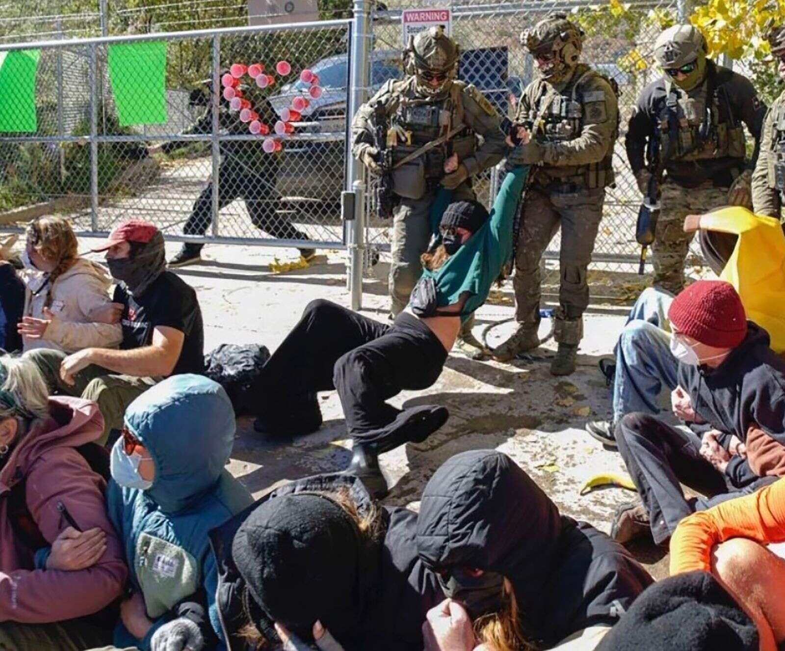 Unidentified officers wearing tactical gear pull Drew Collie, 22, away from the U.S. Immigration and Customs Enforcement field office in Durango on Oct. 28. Collie linked arms with other demonstrators to try to block ICE agents from transferring two detained children, she said. The protest was largely peaceful before the armed men came around noon, she said. (Josh Stephenson/Special to the Durango Herald)