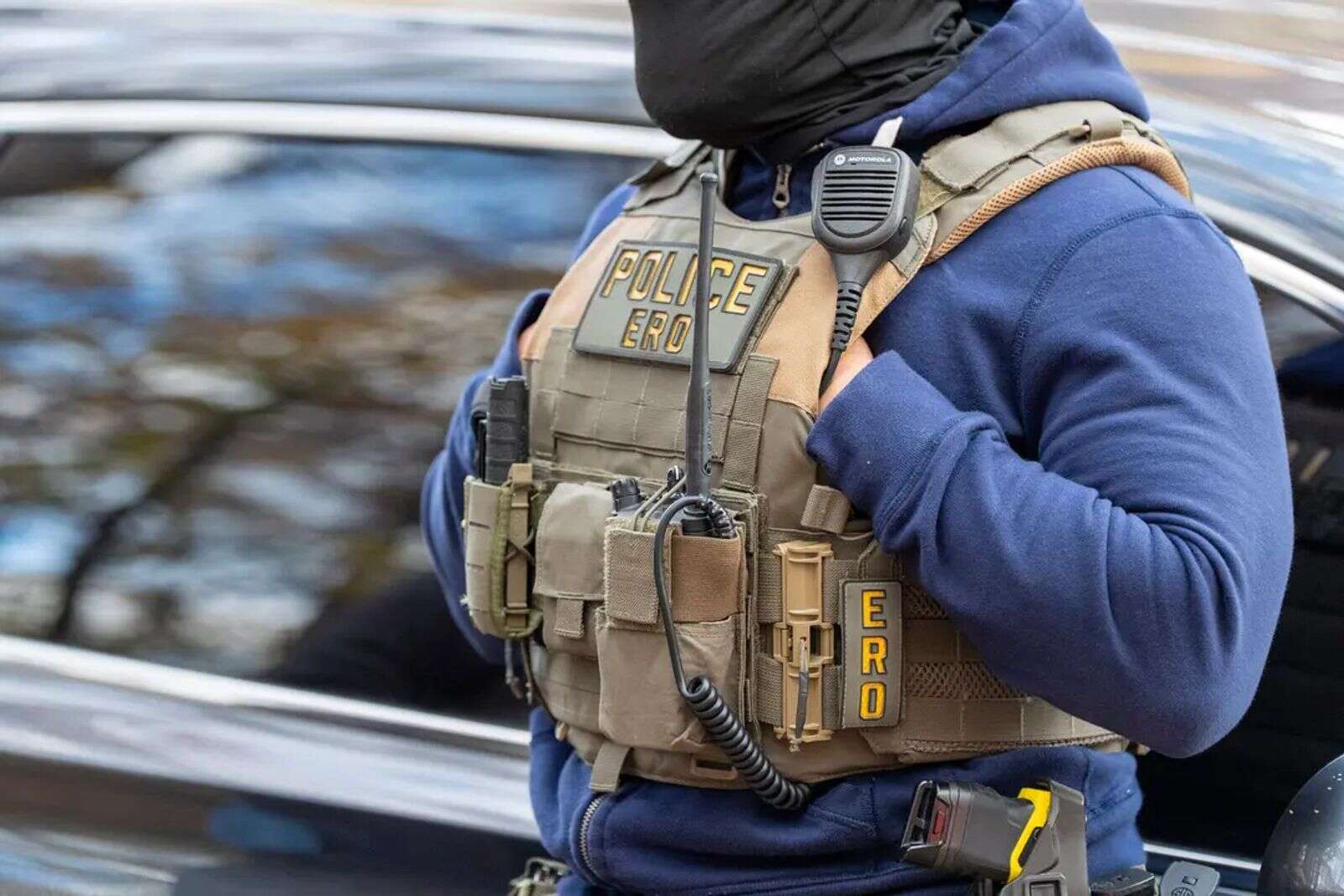 Federal law enforcement officers with Immigration and Customs Enforcement and Enforcement and Removal Operations conduct a traffic stop and detain people, in Washington on Nov. 17. (Alex Brandon/Associated Press)