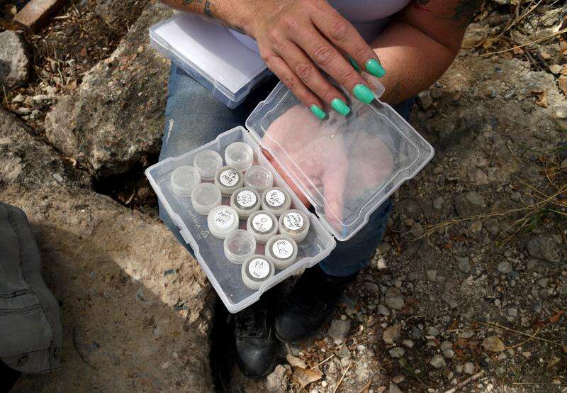Crystina Page, whose son's body was among nearly 200 found decomposing in a southern Colorado funeral home in 2023, holds samples of fake ashes that were given to families instead of human remains, at a memorial site in Colorado Springs, Colo., on Wednesday, April 22, 2026. (AP Photo/Thomas Peipert)