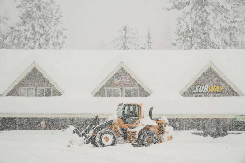Snow is plowed in front of businesses during a snow storm Thursday, Feb. 19, 2026, in Soda Springs, Calif. (AP Photo/Godofredo A. Vásquez)