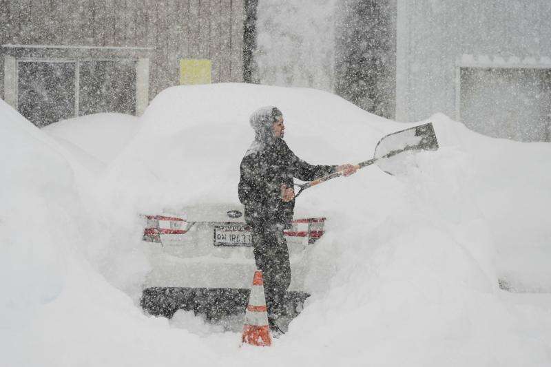 Adrián Narayan digs his car out of the snow Thursday, Feb. 19, 2026, in Soda Springs, Calif. (AP Photo/Godofredo A. Vásquez)