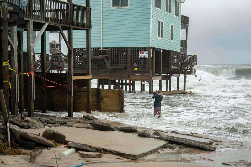 The waves were ferocious at the Hatteras Island town of Buxton, where several beachfront homes have fallen into the water in recent weeks. One house was losing its pilings Sunday and appeared close to collapsing.