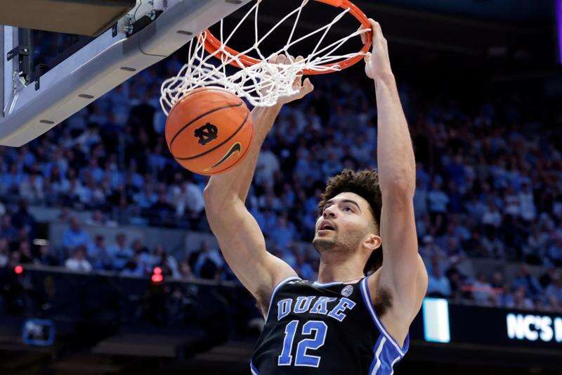 FILE - Duke forward Cameron Boozer dunks during the second half in an NCAA college basketball game against North Carolina, Saturday, Feb. 7, 2026, in Chapel Hill, N.C. (AP Photo/Chris Seward, File)