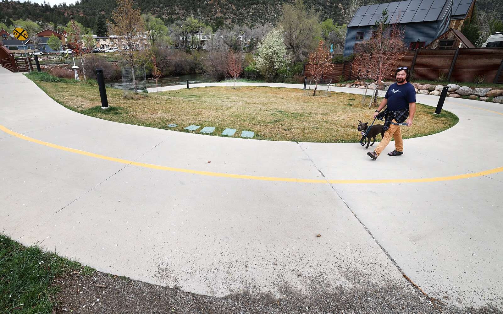 Cooper Semple walks his dog Cleo on a newer section of the Animas River Trial on Thursday near 32nd Street. The trail is called the “crown jewel” of Durango for its connectivity between downtown, major trailheads and city parks. (Jerry McBride/Durango Herald)