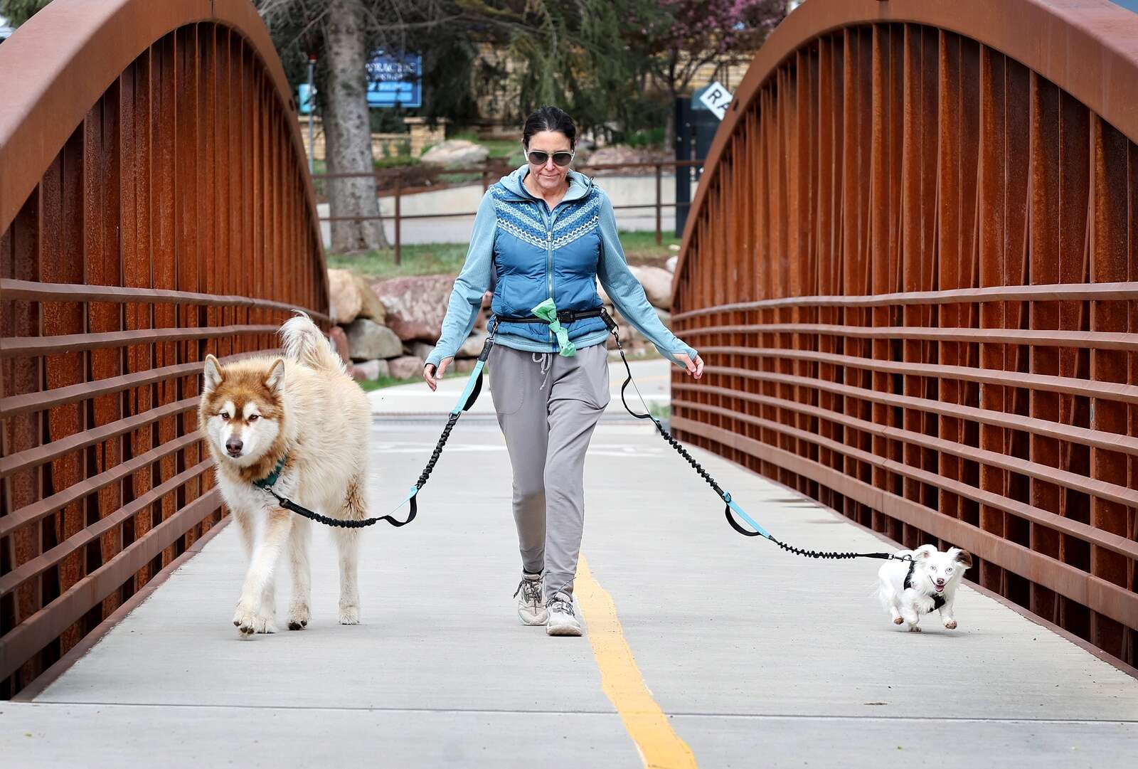 Jessica Corley walks her dogs, Rufous, left, and Bonnie over one of the eight pedestrian bridges on the Animas River Trial on Thursday. Corley said she loves the trail and uses it every day. The Animas River Trail is a 50-year-long project that hasn’t quite reached its end – Three Springs – but city officials say it is getting there. (Jerry McBride/Durango Herald)