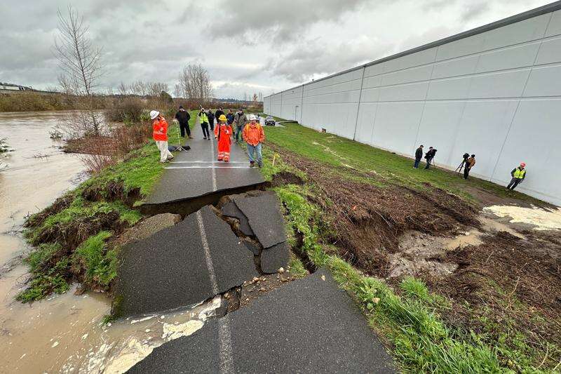 A section of paved bike path along the top of the levee in Tukwila cratered and broke where the levee washed away beneath it.